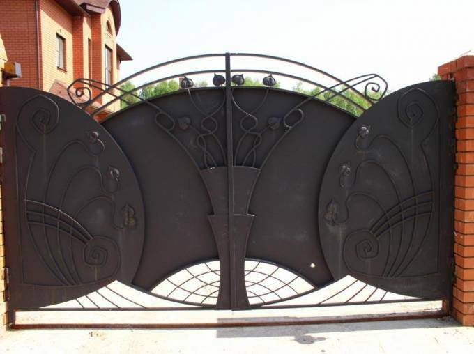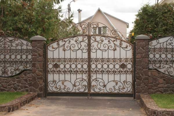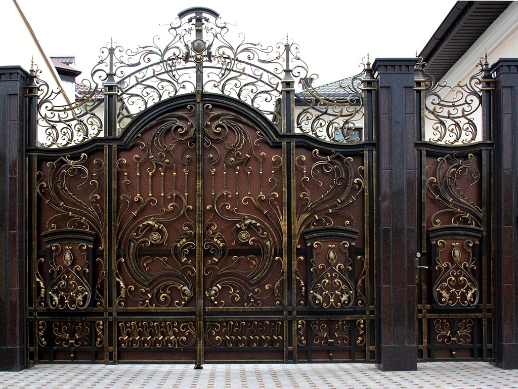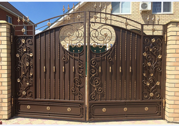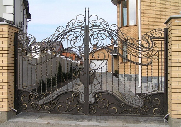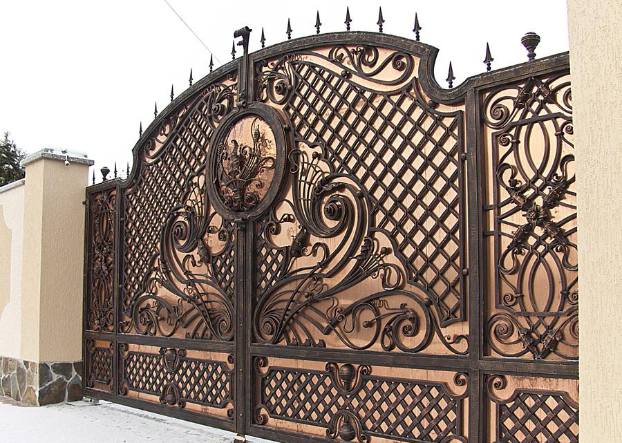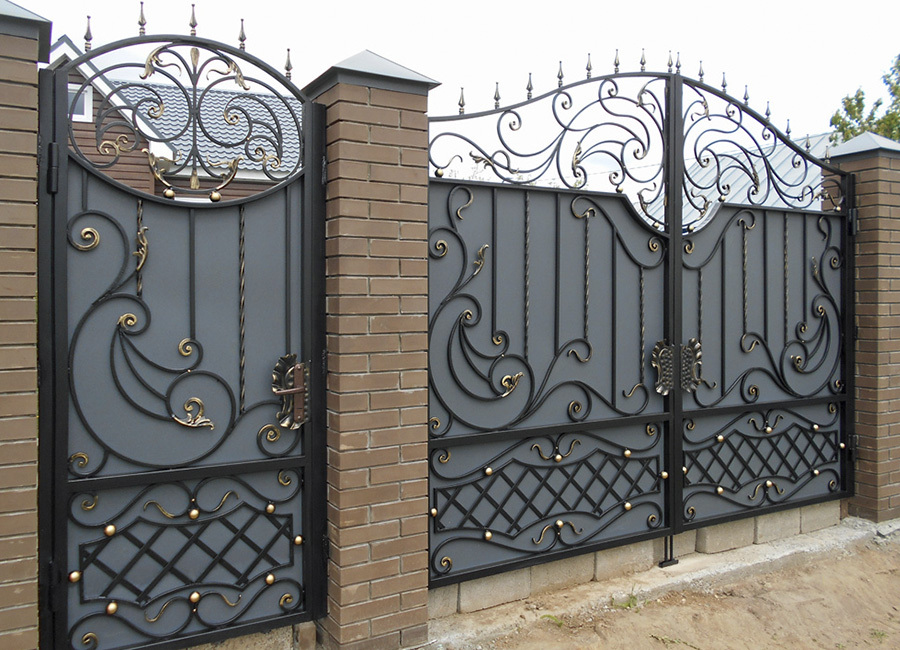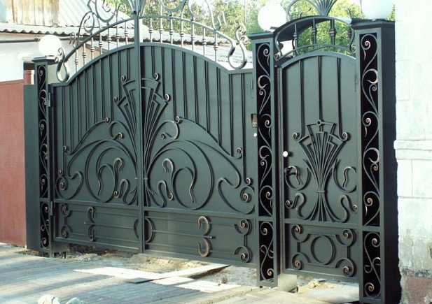 Кованые ворота можно условно разделить на три основных вида по типу дизайна. Во-первых: «глухие», закрытые металлическим листом ворота. Как правило, такие ворота украшаются накладной или отстоящей от листа ковкой. По верху ворот можно расположить ряд декоративных элементов или пик. Во-вторых: «прозрачные», решетчатые ворота. Этот тип ворот отличает внешняя легкость конструкций, часто используется художественная ковка. Решетчатые кованые ворота, как правило, невысокие, с фигурной формой верха. И в-третьих: «комбинированные» ворота, где низ закрыт листом с накладной или отстоящей от листа ковкой, а верхняя половина состоит из кованого, часто художественного, узора. Это наиболее распространенный и популярный тип кованых ворот. Верх и нижняя закрытая часть ворот могут иметь фигурные формы, абстрактные или соответствующие основной теме рисунка ворот. Все вышесказанное, в равной мере, относится как к кованым воротам, так и к кованым калиткам.